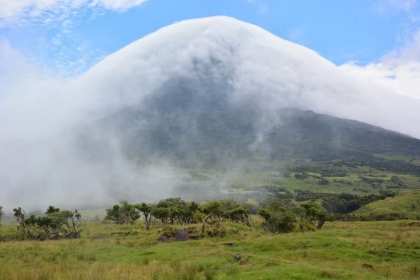 Partimos do chuvoso Pico das Lajes. No planalto já estamos acima das nuvens e o Pico apresenta-se com arrebatador esplendor. Imponente. Desafiante. Como que a seduzir-nos para experiência brutal. Quando chegamos à casa da montanha, onde tudo começa, já o cenário altera por completo… Mal se vê e o orvalho tudo abraça.