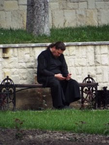 Há um clérigo que descansa. Parece-me que envia um sms. Com destinatário divino? Nós também precisámos repousar e dirigimo-nos a um cafezinho. Que agora está em festa. A música em decibéis pouco toleráveis e já rolou muito álcool. Para já, apenas a família. E nenhum dos membros parece em estado… normal. Pelos preparos de farta mesa, a noite promete. E a nossa é de volta a Chisinau, pois estamos quase de partida…
