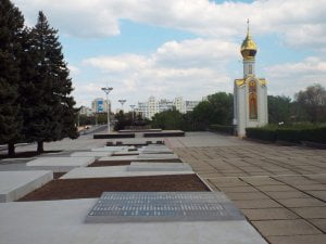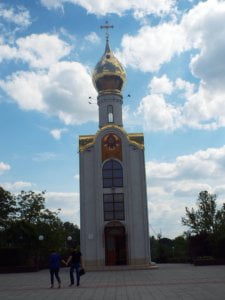 Estamos na zona central de Tiraspol onde se concentram boa parte dos seus encantos. A começar por igreja singular, na forma e conteúdo, bem exíguo. Não tem mais do que meia-dúzia de metros quadrados e vigia a ‘chama eterna’ dos que já se foram em nome da Transnístria. Todos a respeitam: benzem-se ao passarem pela mesma ou entram para uma pequena oração ou para acender uma vela. É ortodoxa e a sua cúpula parece uma cebola dourada.