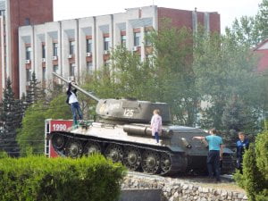 Ao lado, a poucos metros, um tanque de guerra. Crianças e adultos brincam com o T-34, que domina a praça e foi aqui colocado para comemorar a vistoria soviética na II Guerra Mundial. Não há atração que mereça mais fotos. Penduradas as crianças. Em pose militar, de peito-feito, os adultos. Homens. Apesar desta estranha familiaridade com o mundo bélico, a verdade é que este é um destino seguro. Em 2006 rebentou um artefacto num autocarro em Tiraspol… e não houve mais registos, conhecidos, de barbaridades iguais. Nas ruas não vislumbro qualquer detalhe que inspire cuidados especiais ao viajante.
